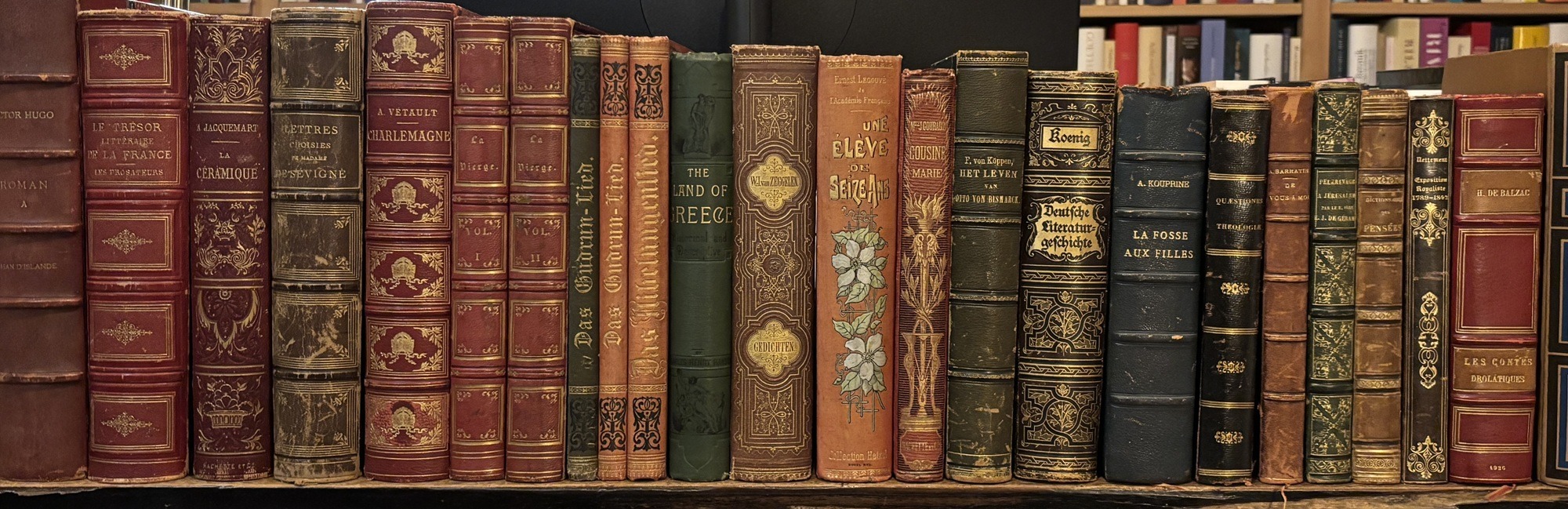 Het zijn allemaal boeken (en sierlijke boekbanden!) uit de periode 1840-1920, veel Franstalige en Duitstalige boeken, stevig in de band, al dan niet met de ribben (vooral de Franse boeken). Geen bedlectuur, alleen al vanwege hun (on)hanteerbaarheid op het nachtkastje, maar geen enkele e-reader kan hier ooit tegenop.