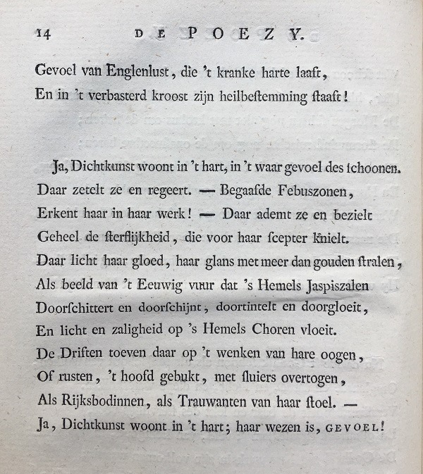 De fraaiste boekdelen uit deze set zijn de twee die buiten de Mengelingen vallen. Ten eerste is er het ambitieuze en hoogdravende gedicht (voorzien van ruim 100 bladzijden ‘Aantekeningen’!) over De Mensch, een bewerking naar Alexander Pope.