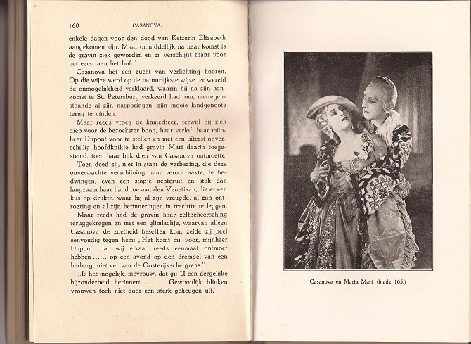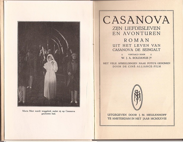 Casanova[, Giacomo]; Zijn liefdesleven en avonturen: Roman uit het leven van Casanova de Seingalt. Met vele afbeeldingen naar foto’s genomen door de Ciné-Alliance-film. – [vert. uit het Italiaans door W.J.A. Roldanus]. Amsterdam: J.M. Meulenhoff, 1928, 1e druk. Gebonden. 269p.