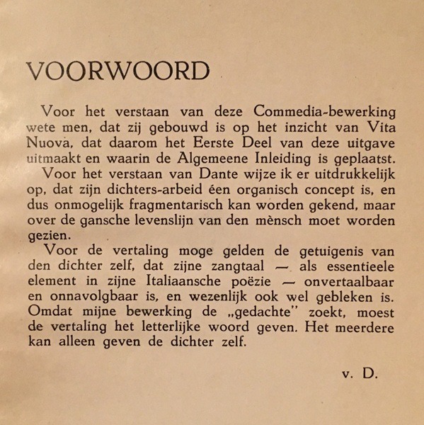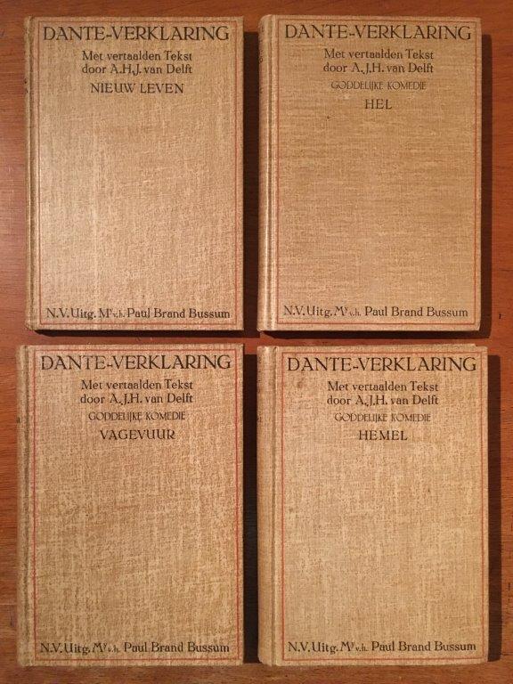 Terug naar de set boeken. Wat deze uitgave óók speciaal maakt, is het opschrift “Dante-Verklaring”. De uitgave is dus nadrukkelijk bedoeld als verklaring (en niet in eerste plaats als vertaling) van het werk van Dante. De tekstediteur en vertaler, A.H.J. van Delft (waarover zometeen meer), geeft dat ook in zijn voorwoord van deel 1 aan: