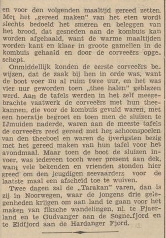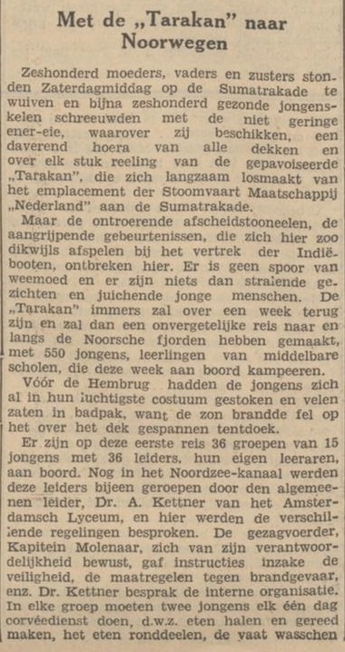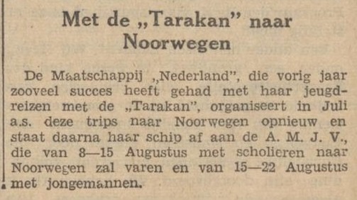 “Net voor de Tweede Wereldoorlog speelde de Tarakan een bijzondere rol. Zo werd het schip in de zomers van 1935, 1936 en 1939 ingezet voor cruisereizen voor Nederlandse jongens naar Noorwegen, een initiatief om jongeren een bijzondere vakantie-ervaring te bieden.”