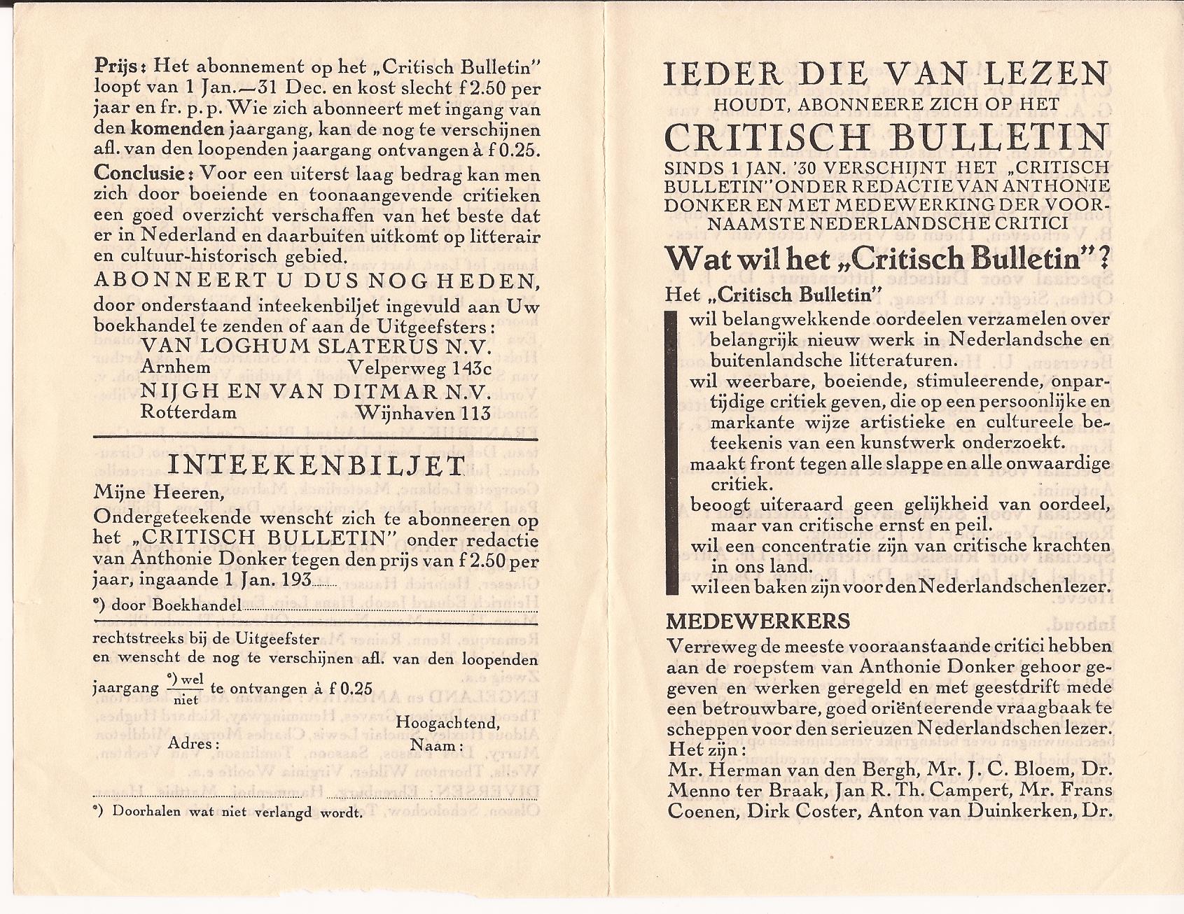 Intekenbiljet Critisch Bulletin, jaren 1930