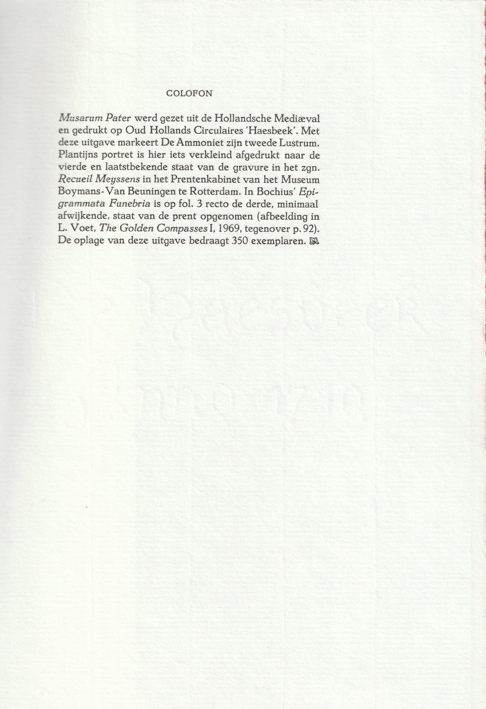 Kuiper, Gerdien C. [tekst & vertaling], Musarum Pater. Een portret van Christoffel Plantijn. Vertaald uit het Latijn door Gerdien C. Kuiper, Ammoniet, Leiden, 1989, 8p. – [ASBN; 18]. – Gezet uit de Hollandse Mediaeval en gedrukt op Oud Hollands Circulaires ‘Haesbeek’, met portretafbeelding van Plantijn.