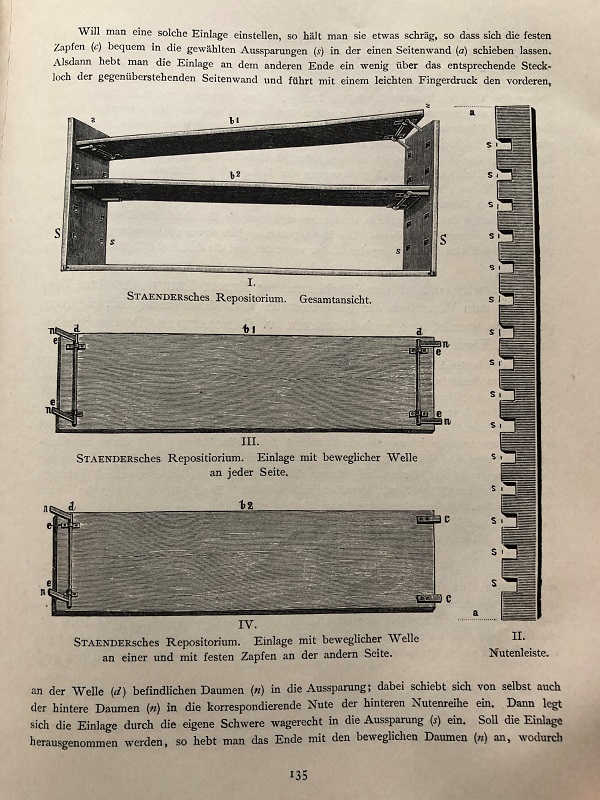 In deel 1 wordt ook aandacht besteed aan de praktische inrichting, binnen in het bibliotheekgebouw (die innere Ausstattung des Bibliothekgebaeudes): de opzet van kasten, rekken en planken. Allerlei technische zaken passeren de revue, zoals plankafstand en hoeveel rijen boeken van de verschillende formaten (folio, quarto, octavo, etc.) passen in een kast. Iedereen die wel eens heeft zitten klungelen met boekenplanken en boekhoogte, herkent hier veel in.