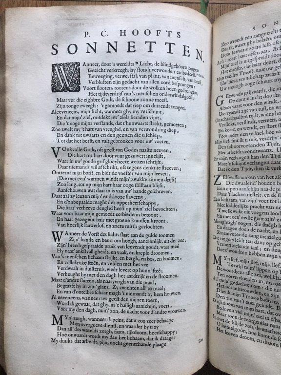 “Ga je mee, een dagje naar Zwolle?” Mijn vrouw was natuurlijk allang op de hoogte van wat ik daar ging doen, u zult het ook wel raden. Iets met een boek, of boeken. Ja, ze wilde wel mee, al was het maar om te zien waarvoor ik nu zo dringend 3 uur heen en 3 uur terug wilde gaan reizen. Het was inderdaad voor een boek, een boek van respectabele leeftijd, van een door mij geliefd Nederlands dichter: P.C. Hooft.