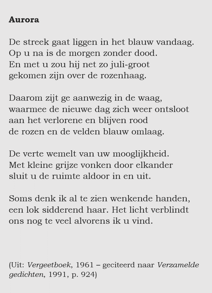 Een heel moderne vertolking van het ochtendgloren vinden we bij Gerrit Achterberg, die dit als gebruikelijk op zijn onnavolgbare wijze doet en daar, net als Vondel, metafysische implicaties aan verbindt: