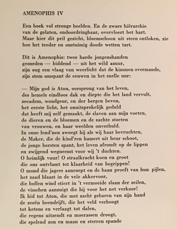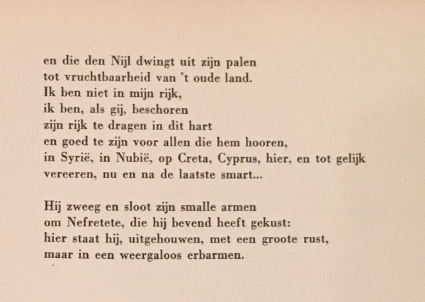 Toon en ritme – er zit iets strak gecomponeerds in de ogenschijnlijk wat grillige vorm – geven dit gedicht zijn dwingend poëtisch karakter, al doet het in de verte inhoudelijk een beetje aan “Cheops” denken van J.H. Leopold.