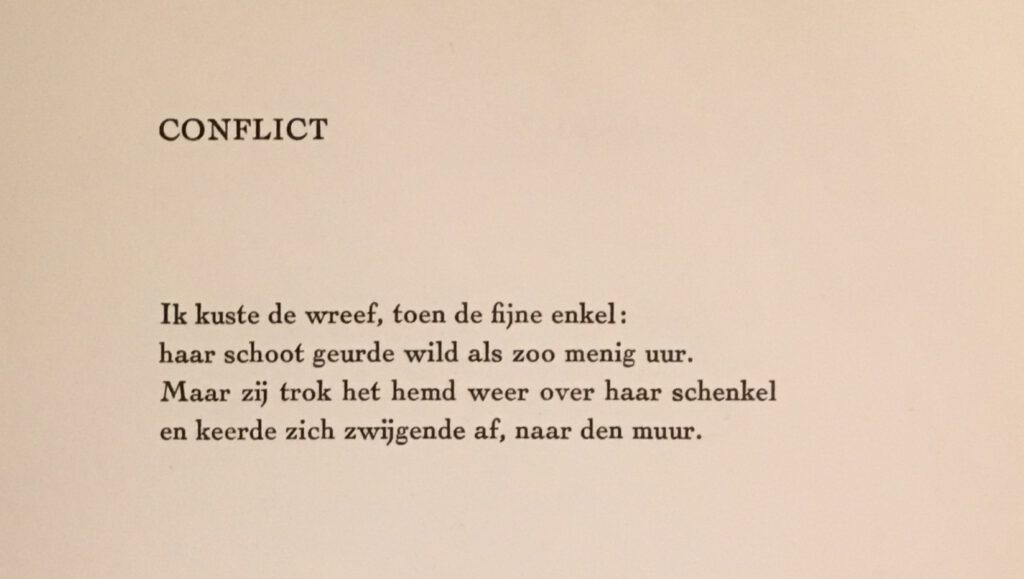 Er is ook een gedicht, ten opzichte van 1932, weggelaten: het vier-regelige Conflict, dat vooral binnen de kring van De Nieuwe Gemeenschap (juli-augustus 1934, p. 424) voor veel ophef heeft gezorgd: