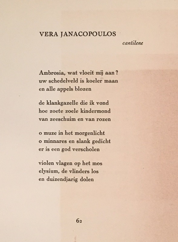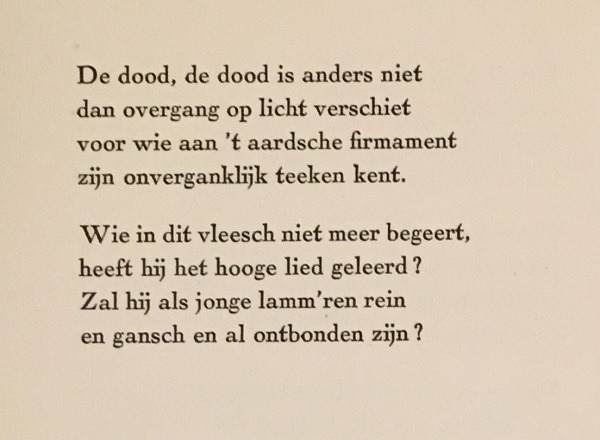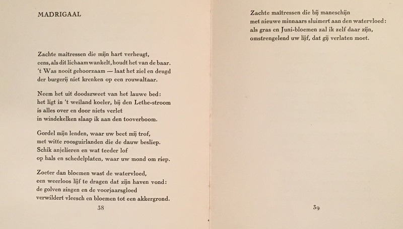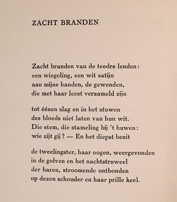 Een van de mooiste gedichten uit Tuin van Eros, we kwamen het al tegen bij de behandeling van Sine Nomine (1930) vind ik persoonlijk nog altijd “Zacht branden”.