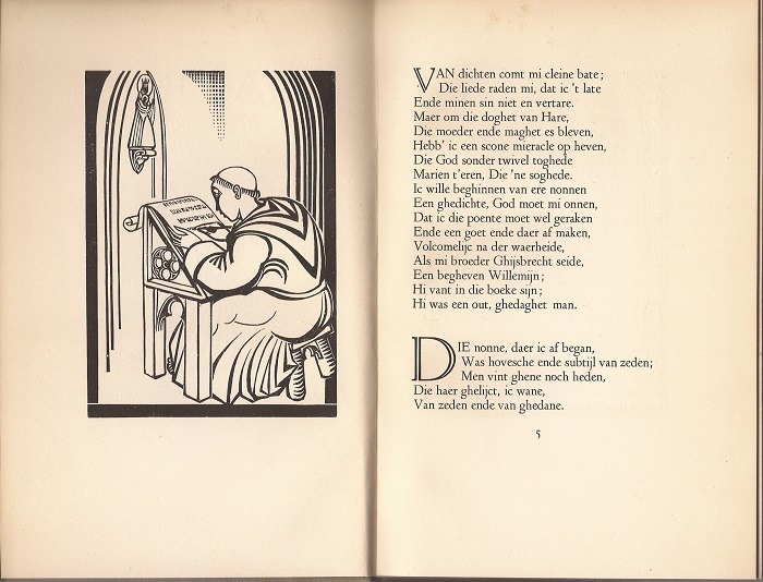 Ik bezit helaas niet een der 25 exemplaren op Hollandsch papier, maar dat drukt de pret nauwelijks en daar was de prijs ook naar. Typografisch is dit boekje, zoals vaak bij uitgaven van A.A.M. Stols, weer zeer fraai vormgegeven: gezet in de mooie letter Lutetia. Daarnaast is het boek “verlucht” met houtsneden van Victor Stuyvaert (1897-1974), een Belgische grafisch ontwerper die zeer bekend was om zijn houtsnijwerk.