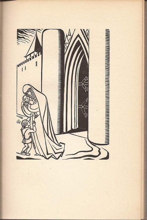 De houtsnedes in dit boek opgenomen zijn inderdaad heel bijzonder, zoals onderstaande afbeelding van Beatrijs met haar twee kinderen, achtergelaten door haar geliefde.