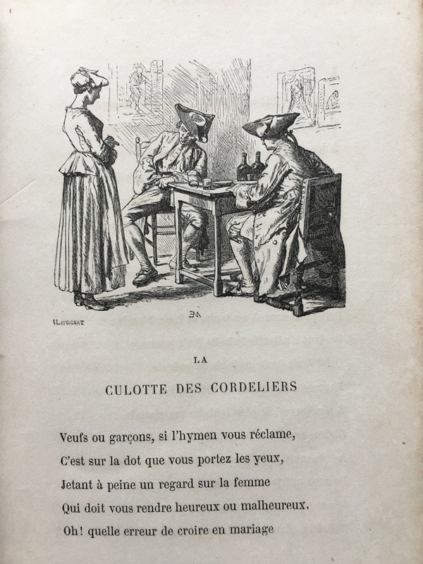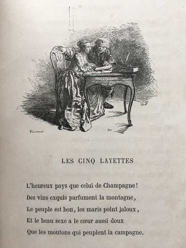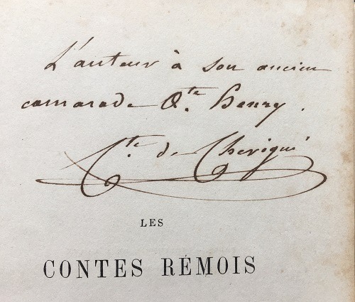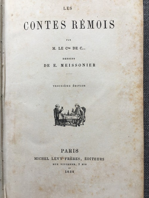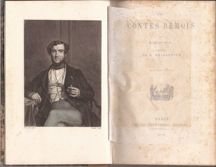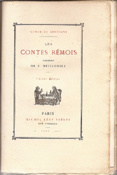 Tot mijn grote verbazing stuitte ik op een Franstalig werkje, met gedichten en prentjes uit het jaar MDCCCLXIV (1864), getiteld Les Contes Remois. Oftwel: verhalen van Reims, de Noord-Franse plaats waar de auteur leefde en overleed. Deze “Comte de Chevigné”, blijkt Louis de Chevigné (1793-1876) te zijn. De uitgevers van dit boekje waren de gebroeders Michel Levy te Parijs.