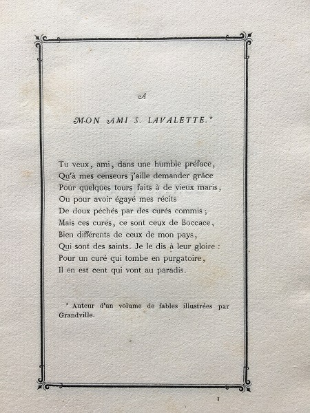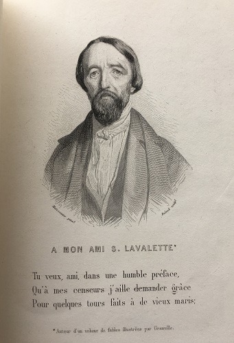 Een aantal vragen heb ik nog niet kunnen beantwoorden. Wie is precies die vriend, Charles Sourdille de Lavalette (in de 3e editie kortweg als S. Lavalette aangeduid), tot wie het voorwoord is gericht en van wie ook een portret is opgenomen in verschillende edities, waaronder beide exemplaren in ons bezit? Waarom is hij zo belangrijk voor de auteur of dit boek? Onder diens portret wordt vermeld dat hij auteur van “Fables illustrées par Granville” is – daar zou ik meer over willen weten, evenals over die Granville. Verder ben ik nieuwsgierig naar E. Meissonier, die in beide (en tussenliggende) edities een groot deel van de illustraties heeft verzorgd.