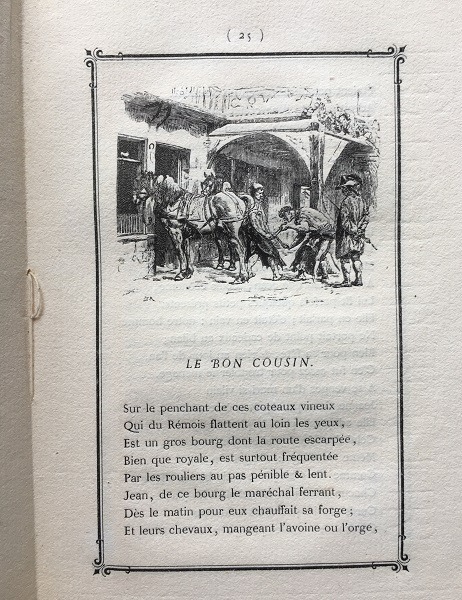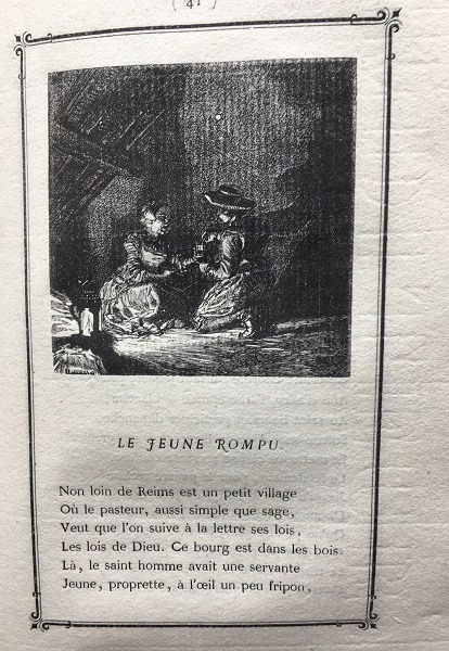 | 1864 | 6e editie, het exemplaar dat ik dus per toeval en voor een prik tegenkwam. Opvallend zijn de tweekleurendruk van de titelpagina (rood en zwart) en de inkadering van de tekst. Net als in de 3e editie ook hier weer achteraan “Opinion des journaux sur les Contes rémois” (zeg maar “stemmen uit de pers”) opgenomen. Vignet en overige lay-out lijken veel op de 3e editie. Wel is er nu een medaillon met daarop de (oudere) auteur afgebeeld. Mijn exemplaar is een “paperback” (een beetje anachronistische term, maar het gaat om een niet-ingebonden exemplaar ingenaaid met een zachte, papieren kaft). Behalve Meissonier, die eerdere edities van illustraties voorzag, zijn er nu ook prenten van Foulquier. |
