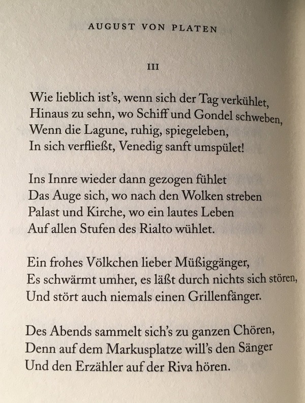 In de Duitse versie, in tegenstelling tot de Nederlandse vertaling, zien we overal vrouwelijk rijm, wat het op een of andere manier zangeriger maakt, waardoor het schweben en umspülen bijna zichtbaar wordt in de regels. Hoe liefelijk (Claes vertaalt: “heerlijk”) is het als de zon gaat dalen, je over de lagune uitkijkt, die de stad zacht, teder omspoelt.