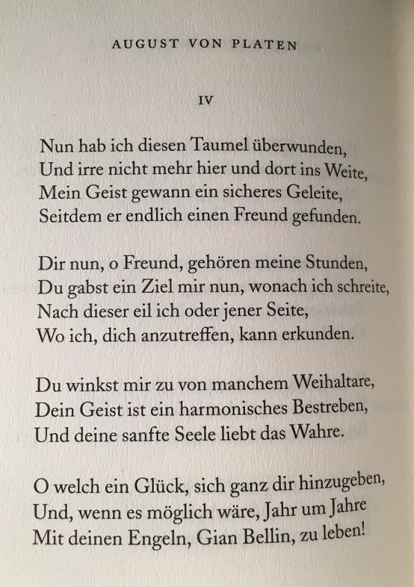 De sonnetten van August von Platen zijn op aangename wijze klassiek: soepel, elegant, waardoor elke regel een statement in zich bergt dat op een bepaalde manier als “onweerlegbaar” kan gelden. In de vertaling van Paul Claes blijft dat gevoelen grotendeels overeind – en voor de rijmwoorden is het prettig dat Duits en Nederlands relatief verwant zijn.