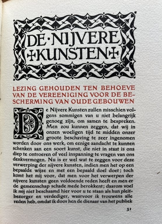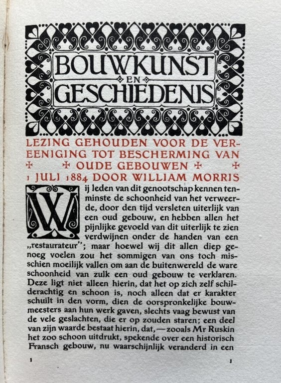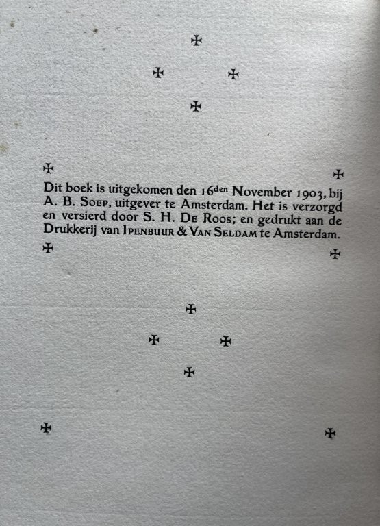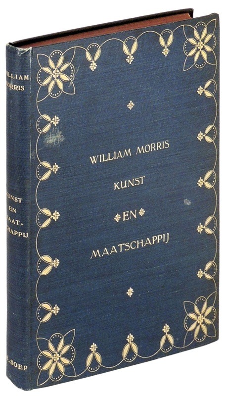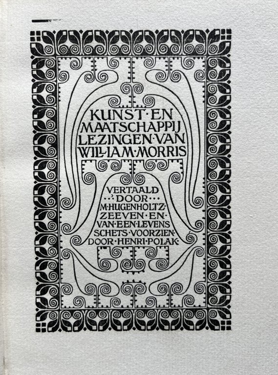 Morris, William, Kunst en maatschappij. Lezingen van William Morris, en van een levensschets voorzien door Henri Polak. Vertaald uit het Engels door M. Hugenholtz-Zeeven, A.B. Soep, Amsterdam, 1903. 1e druk – Gebonden, VII+159p. – Versieringen ontworpen en getekend door William Morris. – Boekverzorging: S.H. de Roos. Gedrukt door Ipenbuur & Van Seldam, Amsterdam, op papier van Van Gelder. Oplage 200, dit is nr. 14. Dit is een van de exemplaren met volledig perkamenten sierband (‘full vellum spitzel binding’).