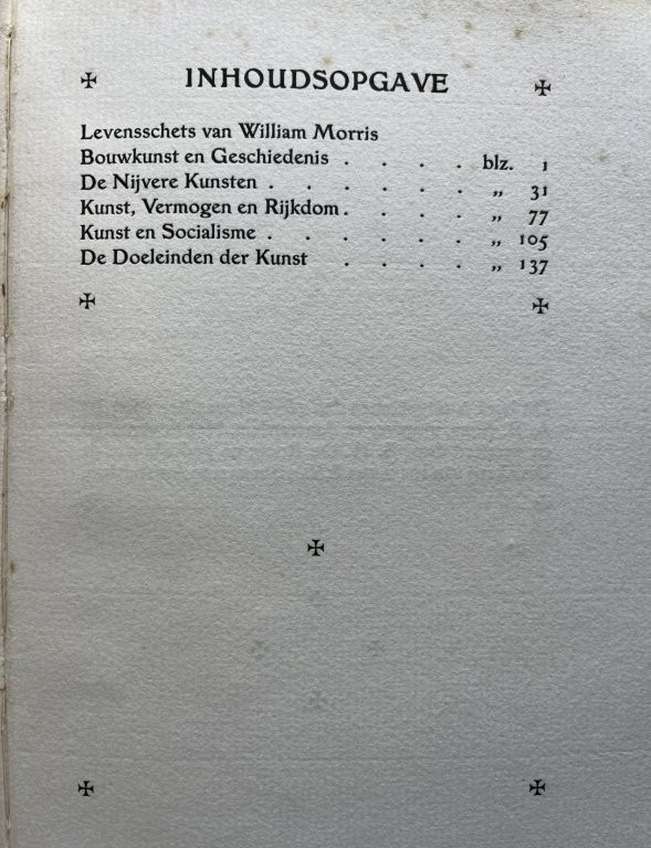 Onlangs ontving ik een heel mooi boek per post. Ik had dit bemachtigd via Marktplaats, en tot mijn verbazing was er niet of nauwelijks op geboden en heb ik het voor een heel mooi bedrag kunnen kopen. Het gaat om de in 1903 verschenen vertaling van William Morris’ Kunst en maatschappij.