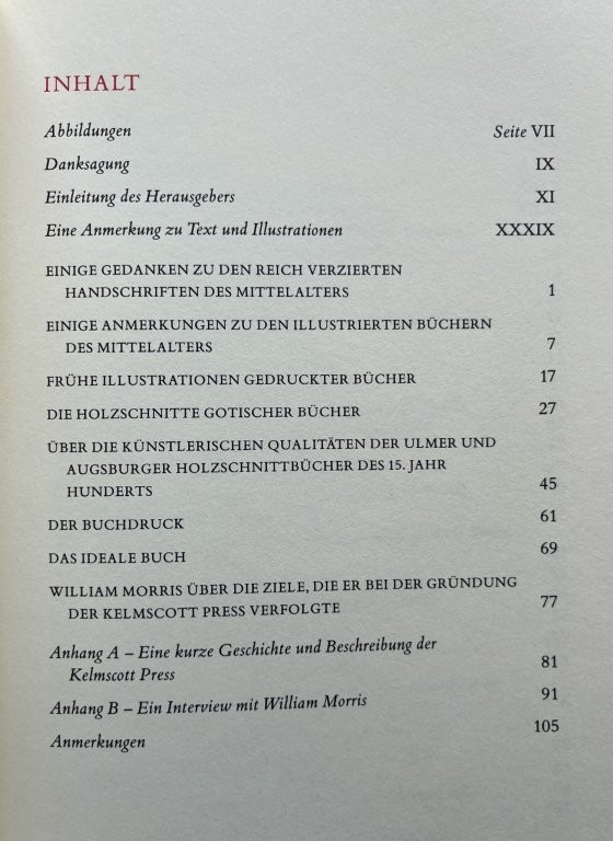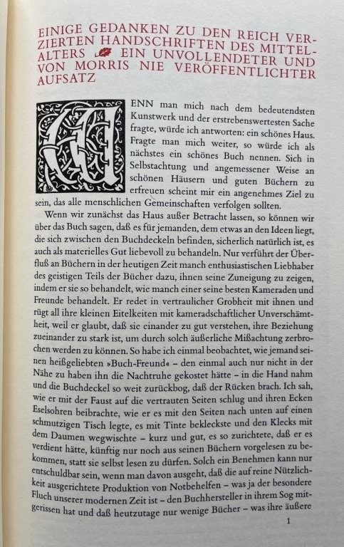 Natuurlijk was Morris voor ons geen onbekende, aangezien we al een moderne Duitse vertaling hadden van enkele opstellen over de kunst van het mooie boek: